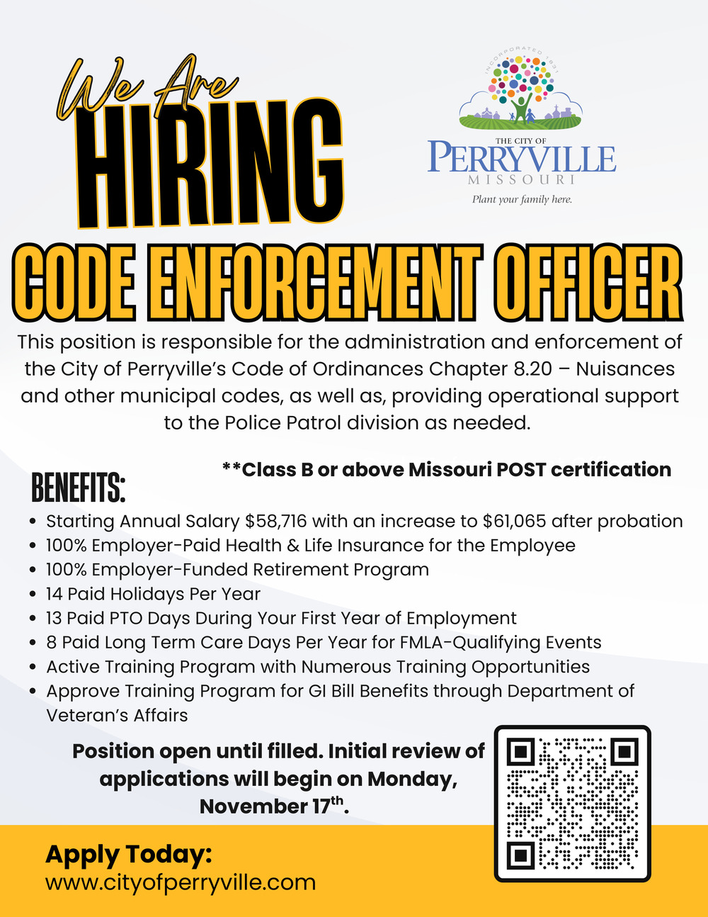 Code Enforcement Officer Job Opening in Perryville, MO