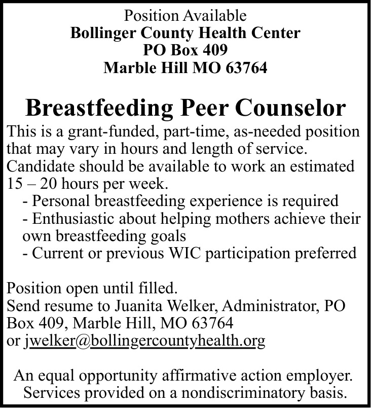 Send resume to Juanita Welker, Administrator, PO Box 409, Marble Hill, MO 63764 or